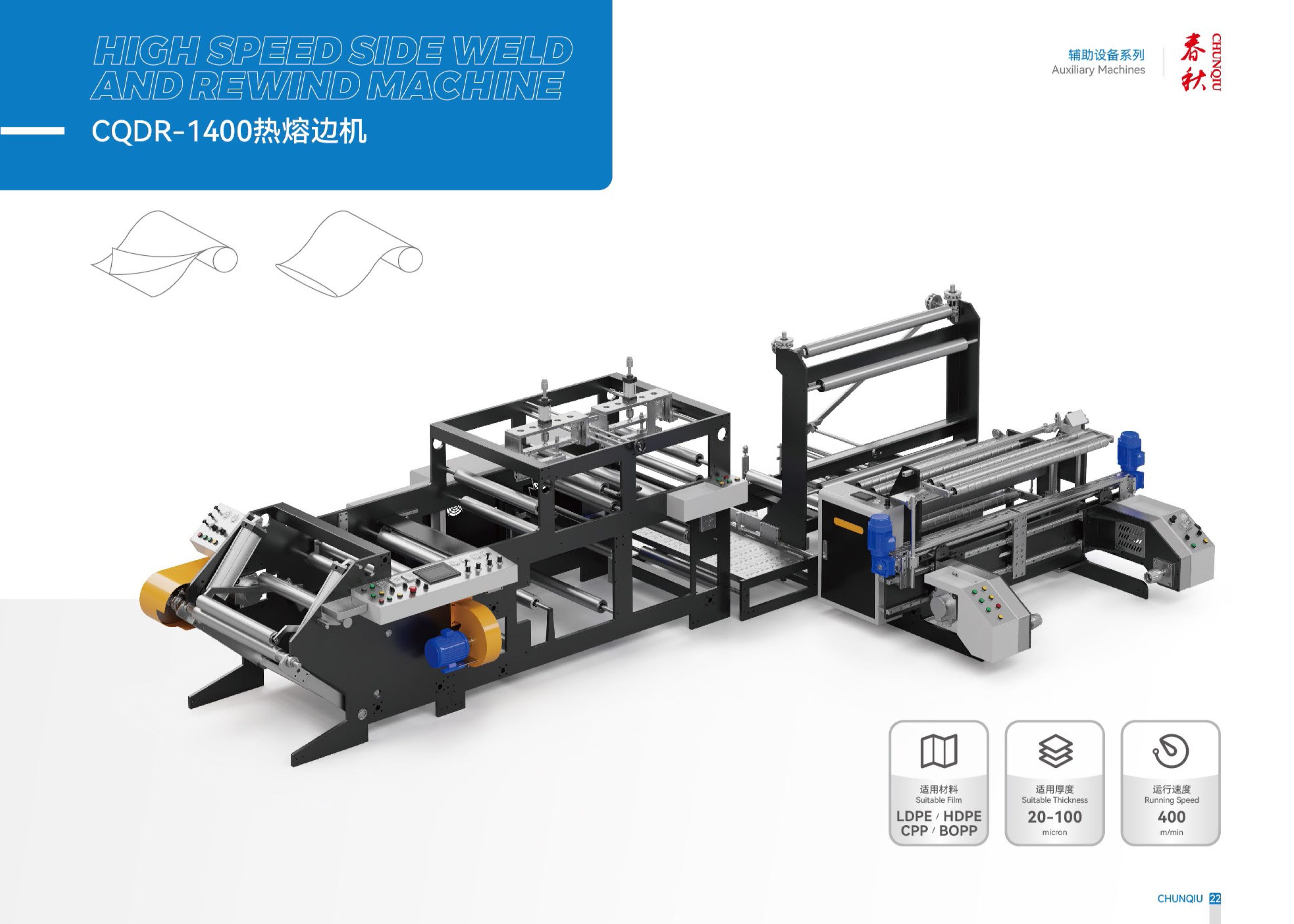 该机主要通过热熔边的方式,把塑料片膜做成筒膜并收卷。共有3把刀,2把熔边刀,1把美工刀,都带有加热功能,在高速300米每分钟的情况下,可以保证熔边的牢固与美观。整机采用4套伺服控制,运行平稳,放卷采用全电动控制,方便操作。