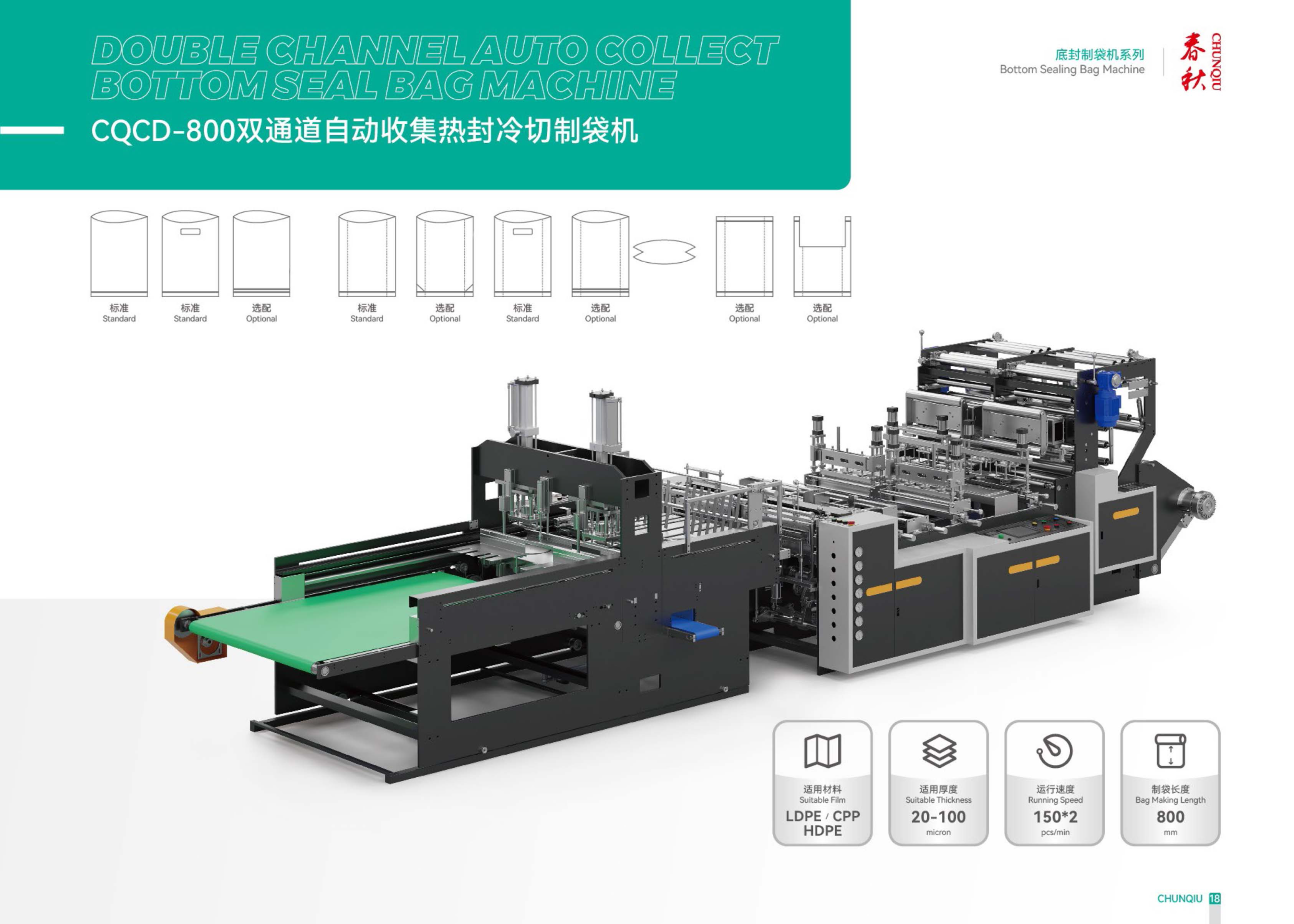 该机属于双通道热封冷切机,出料前面带手提孔冲床,适合做商场购物手提袋或其他具有类似功能的袋子。生产效率高,自动化程度高,操作方便。